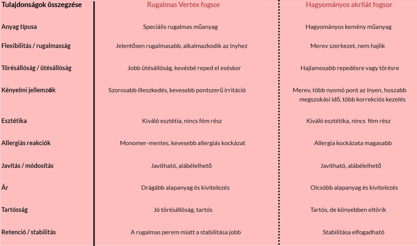 Javítható és alábélelhető, fémes részeket nem tartalmaz, az esztétikája a lehető legtermészetesebb. Míg a hagyományos akrilát fogsorok esetében a szabad monomerek allergiát okozhatnak, addig a Vertex fogsor antiallergén. Részleges és teljes foghiányok pótlására is alkalmas. Drágább anyagára ellenére a rendelőnkben ez a leggyakrabban választott fogsor.